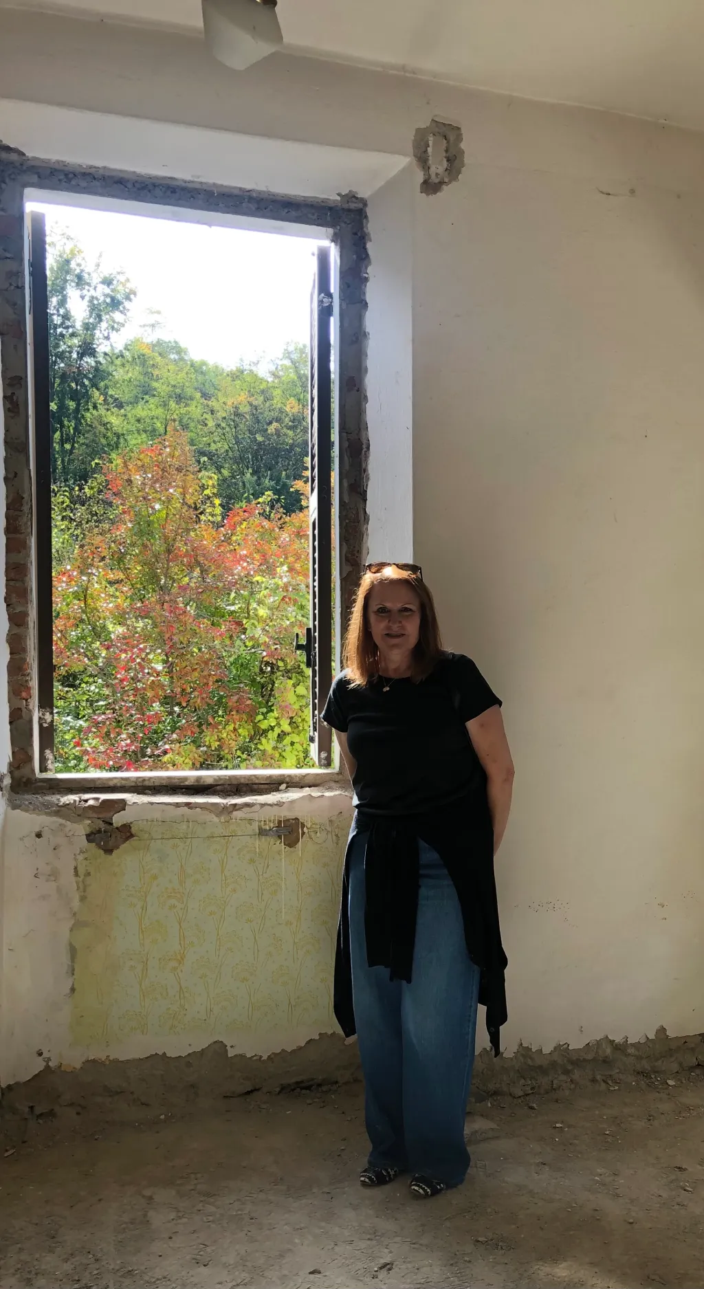 I climbed the old stone staircase to the second floor, following Maurizio. The upstairs made a bit more sense. Four defined rooms all with crumbling walls and concrete floors, a hallway down the middle and each separate room had a short, very old door. At the front of the hallway was a French door leading to a very small, very precarious “balcony”. I bravely stepped through the door and onto the balcony.